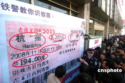 2009年1月10日,杭州鐵路公安處民警在杭州火車站售票處廣場(chǎng)教旅客識(shí)別真假火車票。春運(yùn)期間,杭州鐵路警方針為了防止旅客群眾特別是眾多農(nóng)民工朋友在購票過程中上當(dāng)受騙,根據(jù)假火車票的原型同比放大50倍制作成假票宣傳展板,在杭州火車站前教授旅客識(shí)假票知識(shí)。中新社發(fā) 施健學(xué) 攝