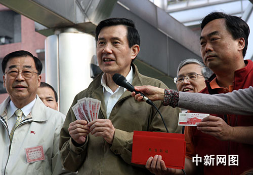1月18日上午,備受全臺和外界關(guān)注的消費(fèi)券開始在臺灣各發(fā)放所發(fā)放。圖為馬英九今天上午九時許來到臺北市第1291號消費(fèi)券發(fā)放所領(lǐng)取消費(fèi)券。馬英九隨后發(fā)表講話,呼吁臺灣全體民眾善用消費(fèi)券,積極促進(jìn)內(nèi)需,擴(kuò)大消費(fèi)。陳立宇 攝