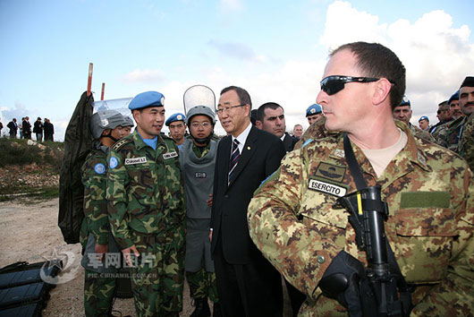 黎巴嫩當(dāng)?shù)貢r間17日,正在中東進(jìn)行外交斡旋的聯(lián)合國秘書長潘基文在視察聯(lián)合國駐黎巴嫩維和部隊(duì)時,專程前往藍(lán)線接見了中國赴黎維和工兵營掃雷官兵。