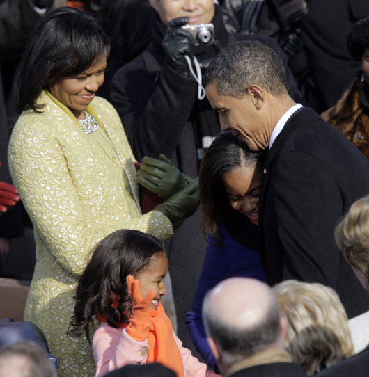 1月20日,奧巴馬步入就職典禮會場后與家人聚在一起。