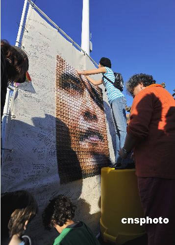 圖為觀眾在一個(gè)由紙鶴組成的奧巴馬總統(tǒng)像上簽名,表達(dá)和平心愿。