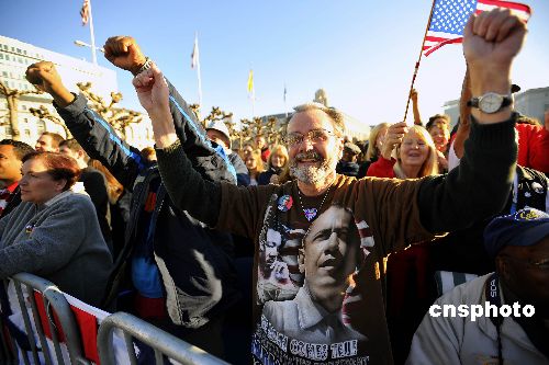 圖為舊金山人歡慶奧巴馬就職美國(guó)總統(tǒng)。中新社發(fā) 陳鋼 攝