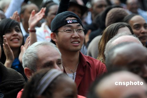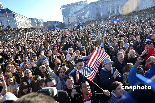 舊金山人們在市政府廣場同步觀看美國第四十四任總統(tǒng)奧巴馬就職典禮。中新社發(fā) 陳鋼 攝