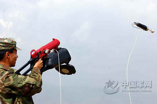 由我國(guó)自主研發(fā)采用空氣推進(jìn)技術(shù)生產(chǎn)的,它在一只0.5L氣瓶?jī)?nèi)灌入20Mpa的壓縮空氣,其射程為50~90m,具有體積小,重量輕,安全可靠,攜帶方便等特點(diǎn),得到掃雷作業(yè)手的鐘愛(ài)。