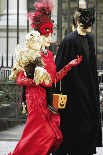 《木乃伊》系列影片女星瑞切爾·薇茲身著古怪的紅色羽毛裝,手拎南瓜包亮相紐約街頭。