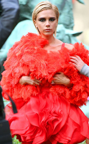 貝克漢姆的妻子維多利亞著迷于高級女式時裝,有時走到了極端。不久前參加巴黎的時裝展時穿上了紅色羽毛裙,給她苗條的身體增添了不少寬度。維多利亞變成了“火雞”形象。