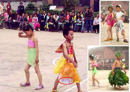 幾名小學(xué)生穿著有創(chuàng)意的服裝,利用廢舊報(bào)紙、綠葉等做成服裝道具,在一簡(jiǎn)陋的校園操場(chǎng)上學(xué)著模特的貓步行走,淳樸天真的表演贏得了許多網(wǎng)友跟帖喝彩,稱“除了能宣傳環(huán)保,還能鍛煉、啟發(fā)孩子”,不過(guò)也有人并不認(rèn)可。