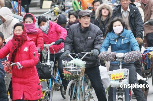 2009年1月22日,江蘇省贛榆縣市民在寒風(fēng)中出行。受強(qiáng)冷空氣東移南下影響,江蘇全省迎來強(qiáng)降溫寒潮天氣,蘇北沿海溫度最低降至零下8攝氏度以下,風(fēng)力9~10級。當(dāng)?shù)貧庀蟛块T發(fā)布寒潮黃色預(yù)警信號,并提醒有關(guān)單位和個人做好防寒保暖和防風(fēng)工作。中新社發(fā) 司偉 攝