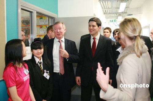 當?shù)貢r間22日下午,英國外交大臣米利班德在曼徹斯特發(fā)布英國政府首個對華關系框架性文件后,與英超曼聯(lián)俱樂部主教練弗格森爵士一起來到斯達芒頓中學,了解該校師生去年訪華的體會。圖為米利班德(左四)和弗格森(左三)與該校的華裔學生在一起。中新社發(fā) 李鵬 攝