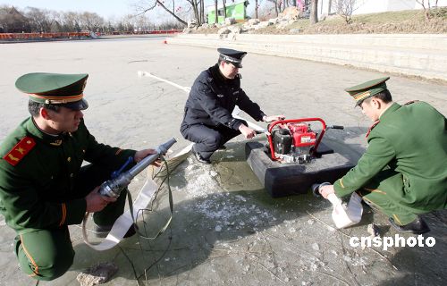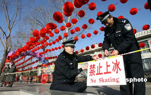 1月22日,北京崇文警方會同相關(guān)部門對龍?zhí)逗䦶R會的各項公眾措施進(jìn)行最后檢查,以確保游人的絕對安全。中新社發(fā) 胡建強(qiáng) 攝