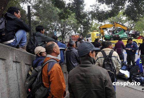 圖為死者的工友在車禍現(xiàn)場關(guān)注事件。中新社發(fā) 鄧慶樂 攝