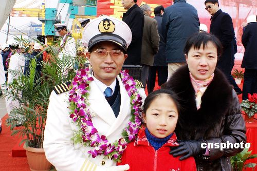 “振華4號”的輪機長和妻女在碼頭相遇,她們母女倆特地從老家連云港趕來迎接。中新社發(fā) 李根 攝