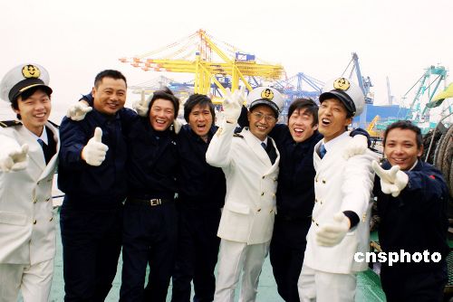 江蘇籍貫的“振華4號”船員斗志昂揚(yáng)地在甲板上向江蘇家鄉(xiāng)父老歡呼。中新社發(fā) 李根 攝