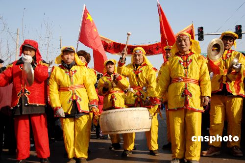 1月26日,山東費(fèi)縣18鄉(xiāng)鎮(zhèn)新農(nóng)村文藝演出隊(duì)進(jìn)城串街表演,他們自編自演精彩的舞獅、舞龍、高蹺、秧歌等傳統(tǒng)民間節(jié)目,將黨的惠農(nóng)政策和新農(nóng)村建設(shè)成果融入演出中,與城里人一同歡慶新春佳節(jié),自由抒發(fā)新年豐收喜悅。中新社發(fā) 劉 濤 攝