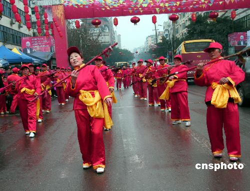 1月26日,正月初一,四川華鎣市舉行民俗文化排街展演,10余個(gè)精彩地方民俗節(jié)目,吸引了數(shù)萬市民觀看。中新社發(fā) 楊天軍 攝