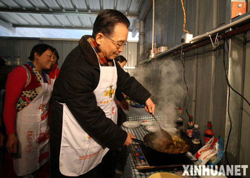 1月25日,溫家寶總理在汶川映秀鎮(zhèn)板房安置小區(qū)吳志遠(yuǎn)等幾家合用的廚房里炒菜。1月24日至25日,中共中央政治局常委、國(guó)務(wù)院總理溫家寶來(lái)到四川受災(zāi)最為嚴(yán)重的北川、德陽(yáng)、汶川等地,和災(zāi)區(qū)人民一起過(guò)年。作者:姚大偉