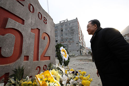1月24日至25日,中共中央政治局常委、國務院總理溫家寶來到四川受災最為嚴重的北川、德陽、汶川等地,和災區(qū)人民一起過年。這是1月24日,溫家寶專程來到北川縣城遺址,在“5·12”地震紀念碑前向大地震中遇難的同胞們獻花、默哀。作者:姚大偉