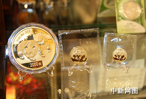 為紀(jì)念大熊貓團團、圓圓來臺與民眾見面。位于臺北市和平東路三段68——1號的臺灣大洋金銀幣有限公司特推出中國人民銀行發(fā)行的2008、2009年熊貓紀(jì)念金幣供臺灣民眾選購。中新社記者 陳立宇 攝
