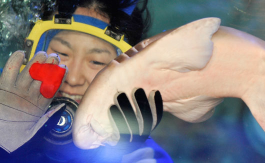 為迎接情人節(jié)到來,2月1日,日本首都東京的一個水族館,潛水員給鯊魚喂食紅心形的魚食。這一充滿浪漫情調(diào)的喂食活動將持續(xù)兩周。