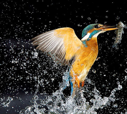 捉到魚(yú)后,翠鳥(niǎo)會(huì)快速?zèng)_出水面。
