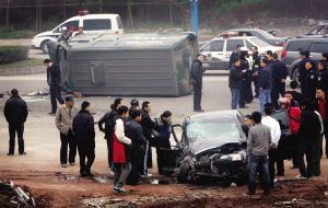 一連串的巨響后,一輛運鈔車180度翻轉后重重地側翻在地,發(fā)生碰撞的轎車則朝前沖出10多米才停下。事故造成6人受傷。