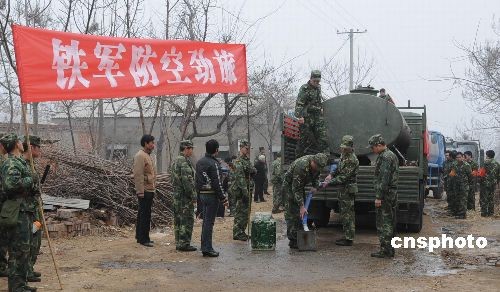 二月六日上午,駐豫六百多名解放軍官兵專程趕赴民眾吃水困難的河南省新鄭市辛店鎮(zhèn)李莊村,將“甘霖”送入民眾家中。二00八年十一月以來,河南省氣偏高,干旱少雨,遭受自一九五一年以來的特大旱情,農(nóng)作物受旱面積達(dá)到百分之六十三點(diǎn)一,四千一百多萬畝麥田受旱災(zāi),部分地區(qū)出現(xiàn)臨時性人畜飲水困難。