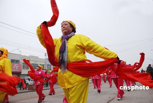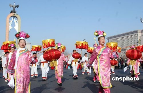 2月9日是元宵佳節(jié),山東省棗莊市山亭區(qū)各鄉(xiāng)鎮(zhèn)的農(nóng)民游藝隊(duì)開展民俗“游街”活動(dòng),高蹺、竹馬、舞龍等傳統(tǒng)民俗表演精彩紛呈。中新社發(fā) 劉明祥 攝