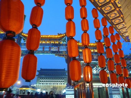 2009年2月8日,農(nóng)歷正月十四,千余盞大紅燈籠及中國(guó)結(jié)將北京前門(mén)大街妝扮出濃郁的節(jié)日氣氛。中新社發(fā) 玉龍 攝