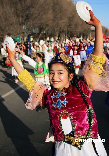 2月9日上午,新疆伊寧市舉行“鬧元宵”社火展演,來自全市20個(gè)鄉(xiāng)鎮(zhèn)、街道的1300余名農(nóng)牧民及社區(qū)工作人員走上街頭,舞龍獅、敲腰鼓、跳民族歌舞,敲出元宵節(jié)的快樂,舞出了邊疆各族兒女的豪邁激情。中新社發(fā) 留光駐影 攝