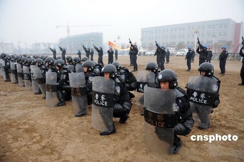 2月12日下午,河北廊坊開始下起小雨,由山東公安邊防總隊組建的中國第八支赴海地維和警察防暴隊在雨中進行處置群體性事件訓練。中新社發(fā) 由永懷 攝