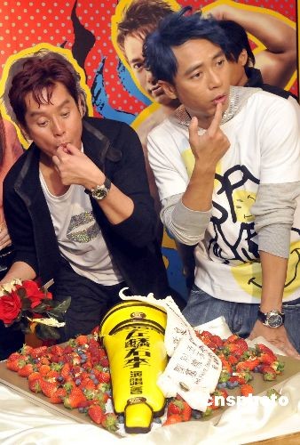 二月十四日晚,“香港二零零九東亞運動會.左麟右李演唱會”在香港紅磡體育館作尾場演出。圖為十五日凌晨譚詠麟、李克勤在演唱會結束后出席慶功會。中新社發(fā) 鄧慶樂 攝