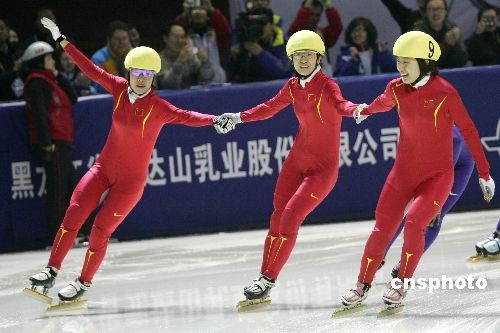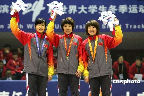 2月19日,世界大冬會短道速滑女子1500米決賽結束,中國隊包攬前三名,周洋以2分31秒658奪得金牌,這也是中國代表團在本次大冬會奪得的首枚金牌,劉秋宏和孫琳琳分列2、3位。中新社發(fā) 富田 攝