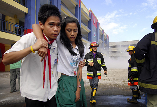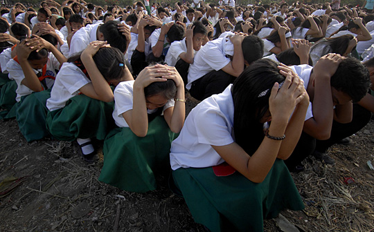 2月27日,在菲律賓大馬尼拉區(qū)的奎松城,參加地震演練的中學(xué)生們蹲在開闊地帶用雙手護(hù)住頭部,同時(shí)他們的同學(xué)在協(xié)助消防部門救助“傷員”。菲律賓在全國(guó)范圍內(nèi)舉行地震演練,以提高抵御災(zāi)害的能力和突發(fā)事件救援的反應(yīng)速度。