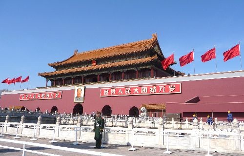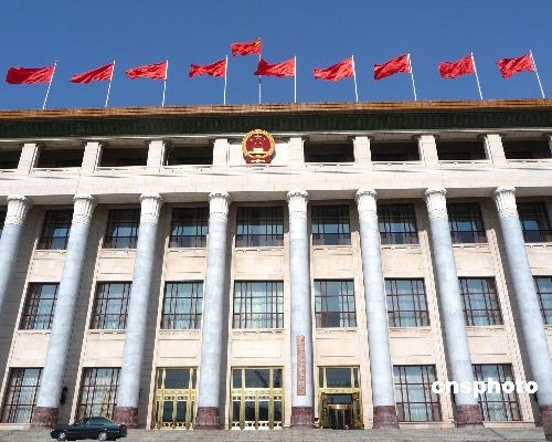 2009年3月1日,北京陽光燦爛、碧天如洗。天安門廣場四周鮮艷的紅旗迎風(fēng)飛舞,洋溢出一派喜慶祥和的氣氛,迎接全國兩會的召開。中新社發(fā) 玉龍 攝