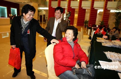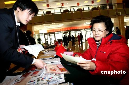 3月2日,參加全國(guó)政協(xié)十一屆二次會(huì)議的全國(guó)政協(xié)委員陸續(xù)向大會(huì)報(bào)到。圖為著名演員宋春麗在報(bào)到處領(lǐng)取會(huì)議材料。中新社發(fā) 傅丹丹 攝