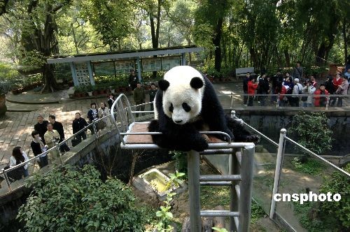 三月十二日,臺灣游客正在福州熊貓世界觀看熊貓。大熊貓“團(tuán)團(tuán)”、“圓圓”在臺灣產(chǎn)生的效應(yīng),致使現(xiàn)在來福州觀看熊貓的臺灣游客比以前增加三倍以上。中新社發(fā) 王東明 攝