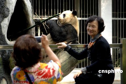 三月十二日,臺(tái)灣游客在福州熊貓世界與熊貓近距離合影留念。大熊貓“團(tuán)團(tuán)”、“圓圓”在臺(tái)灣產(chǎn)生的效應(yīng),致使現(xiàn)在來福州觀看熊貓的臺(tái)灣游客比以前增加三倍以上。中新社發(fā) 王東明 攝