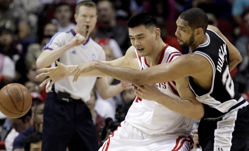 3月15日早上進行的一場NBA常規(guī)賽中,昨天擊敗了山貓的火箭沒有能夠取得連勝。面對西南賽區(qū)的第一名圣安東尼奧馬刺,姚明拿到了18分11個籃板球,鄧肯拿到了15分12個籃板;鸺詈箨P(guān)頭連續(xù)錯失反超和扳平拖入加時的機會,最終以85比88遺憾的輸給了馬刺。
