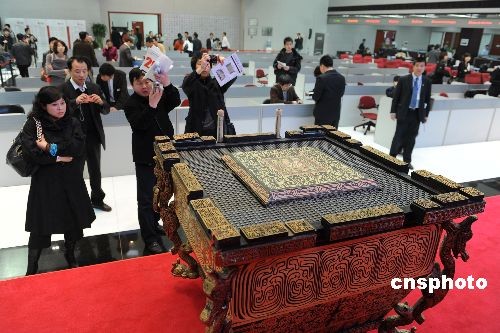 3月18日,2008北京第29屆奧運(yùn)會(huì)開(kāi)幕式演出道具“缶”最后一場(chǎng)專(zhuān)場(chǎng)拍賣(mài)在北京產(chǎn)權(quán)交易所完美落槌。22個(gè)標(biāo)的共320個(gè)缶以總價(jià)4138萬(wàn)元拍出。此外10個(gè)標(biāo)的共200幅竹簡(jiǎn)以總價(jià)637.5萬(wàn)元成交。共有132家單位和個(gè)人參與了此次競(jìng)買(mǎi),單個(gè)“奧運(yùn)缶”的成交均價(jià)12.93萬(wàn)元,超過(guò)第一批“奧運(yùn)缶”成交均價(jià)一倍有余,單個(gè)“竹簡(jiǎn)”成交均價(jià)3.18萬(wàn)元。中新社發(fā) 遠(yuǎn)舟 攝