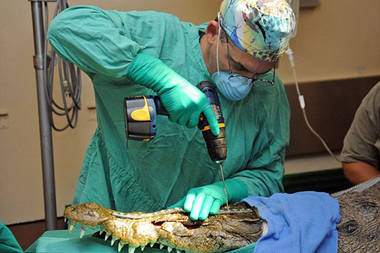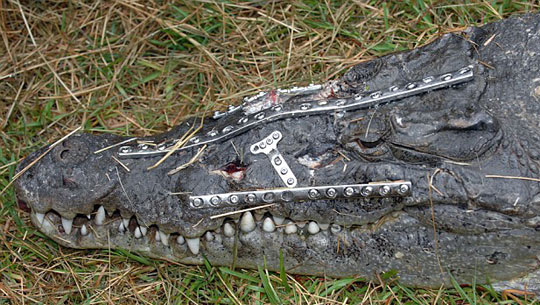 據(jù)英國媒體3月18日報道,美國佛羅里達(dá)動物園一只受傷的大鱷魚,經(jīng)過手術(shù),頭部被41枚釘子以及4塊鐵板固定,現(xiàn)在被人戲稱為“機(jī)器鱷魚”。這只長達(dá)10英尺的鱷魚是在一起車禍?zhǔn)鹿手惺軅。?jīng)醫(yī)生介紹,現(xiàn)在鱷魚的恢復(fù)情況良好。