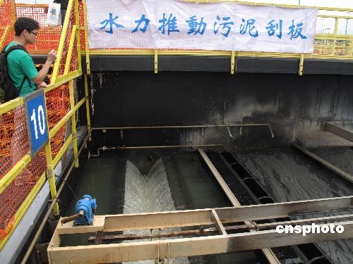 香港特區(qū)政府渠務(wù)署在迎來(lái)成立二十周年之際,于二零零九年三月二十一日向市民開放昂船洲污水處理廠,展示污水凈化處理過(guò)程,介紹和體驗(yàn)港府正斥巨資推行的凈化海港計(jì)劃。圖為市民觀看污水進(jìn)入沉淀池后,水力推動(dòng)的污泥刮板在水面上層刮起一層層黑臭污垢的過(guò)程。 中新社發(fā) 余瑞冬 攝