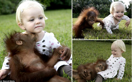 兩歲女孩的猩猩朋友。才一歲大的小猩猩Rishi被美國邁阿密一家動(dòng)物研究所收養(yǎng)后,和攝影師巴里的女兒艾米麗(Emily)很快便成為了好朋友,他們甚至一起玩過家家。
