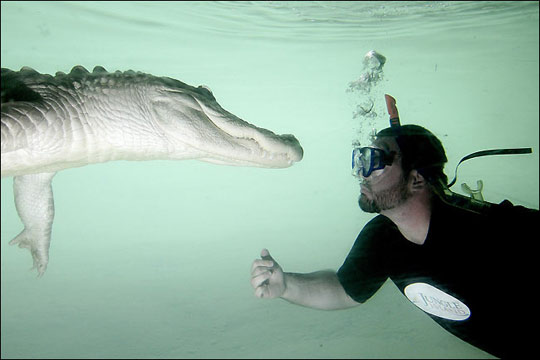 男子與鱷魚(yú)共舞。2009年1月17日,在美國(guó)佛州叢林島動(dòng)物主題公園,男子Sean Manning與一條9英尺長(zhǎng)的美洲鱷在水下上演“人鱷共舞”場(chǎng)面。Sean Manning沒(méi)有采取任何保護(hù)措施,在水下依靠通氣管進(jìn)行呼吸,表演各種高難度動(dòng)作,為觀眾上演水下人鱷大戰(zhàn)驚險(xiǎn)場(chǎng)面。