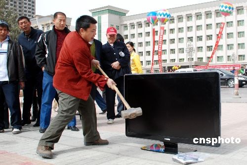 3月22日中午,在新疆庫(kù)爾勒市的中心廣場(chǎng)上,一名市民揚(yáng)起榔頭對(duì)著一臺(tái)嶄新的47英寸飛利浦液晶彩電砸去,這臺(tái)電視瞬間變得七零八落。當(dāng)事人稱(chēng),這臺(tái)電視剛買(mǎi)一個(gè)多月就出現(xiàn)故障,一直得不到售后服務(wù),出此下策。中新社發(fā) 汪濤 攝