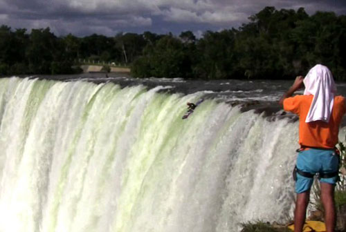 中新網(wǎng)3月24日電 據(jù)英國(guó)媒體23日?qǐng)?bào)道,一位名叫佩德羅-奧麗維亞的巴西小伙,日前乘坐皮劃艇從落差達(dá)38.7米(127英尺)的賽爾托-貝洛(Salto Belo)瀑布“俯沖”了下來(lái)。整個(gè)墜落過(guò)程歷時(shí)2.95秒,在最后時(shí)刻,奧麗維亞的頭部以每小時(shí)70英里的速度撞向翻騰的水面。但他不僅大難不死,而且還如愿以償?shù)拇蚱屏嗽瓉?lái)108英尺的“墜瀑布”世界紀(jì)錄。