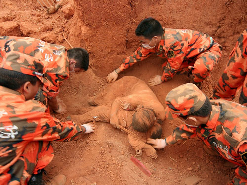 鄒森的這張照片,反映了地震對(duì)人類摧殘,同時(shí)也反映了生死瞬間母親的偉大。這張照片感動(dòng)著世界。照片中的這位母親叫文學(xué)金,和女兒在“8.30”地震中遇難。