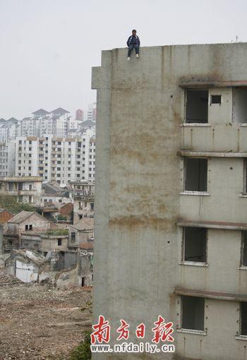 3月31日,一名來自山西太原的男子先后兩次爬上廣東佛山市禪城人民路旁的一棟9層待遷居民樓樓頂,重復(fù)著驚險的“跳樓”情景。當(dāng)日下午2時30左右,該男子坐在該棟樓樓頂邊沿,拒絕警察提供的幫助,結(jié)果不小心滑落,身體懸空,幸好隨手抓了樓頂邊緣,被警察及時救起。不過讓人意外的是,當(dāng)日18:30,該男子又坐在同一棟樓樓頂邊緣,最終在警察及消防人員的勸說下離開。據(jù)公安局相關(guān)人士介紹,該男子姓劉,年紀(jì)不到20歲,自稱因工作壓力、家庭矛盾而“想不開”。目前,該男子已被警察帶至人民路附近派出所“做思想工作”,避免類似事情再次發(fā)生。張由瓊 攝