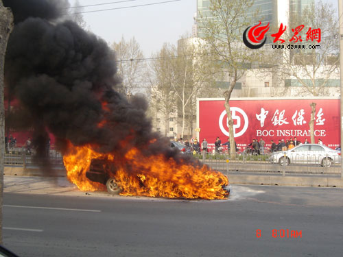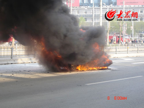 8日早7:50,濟(jì)南市歷山路與和平路路口,一輛轎車在行駛途中突然爆燃,熊熊大火和濃煙頓時彌漫方圓數(shù)十米,迅速而來的消防人員2分鐘撲滅大火,自燃轎車已經(jīng)面目全非,只?蚣,所幸并無人員傷亡。記者用手機(jī)拍下了整場火災(zāi)的全過程。