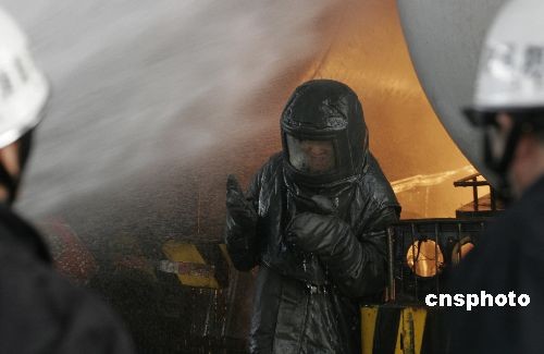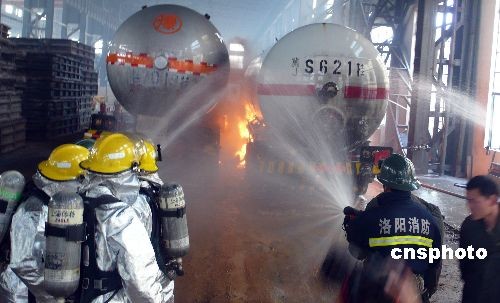 2009年4月13日上午9時許,兩輛液化氣槽車在位于洛陽市城區(qū)北部的紅山工業(yè)園區(qū)洛北鑄鋼廠內(nèi)作業(yè)時引發(fā)氣體泄漏燃燒事故,噴出的液化汽火焰在槽車罐體側(cè)部和底部不斷燃燒,罐體溫度不斷升高隨時都有爆炸危險,周圍數(shù)平方公里的生命和財產(chǎn)面臨嚴重威脅。洛陽消防支隊的10輛消防車輛和80名消防官兵,在多方噴水降溫的同時,冒死沖入火海中控制泄露部位并將兩車有效分離,經(jīng)過2個多小時的撲救,阻止了一起嚴重爆炸事件的發(fā)生,事故未造成人員傷亡。目前事故原因正在調(diào)查之中。 中新社發(fā) 張曉理 攝