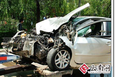 4月14日上午11點(diǎn)40分許,昆明官南路和小街的交叉路口處,一輛公交車與一輛轎車發(fā)生碰撞,造成轎車車頭嚴(yán)重變形。而公交車為避讓轎車,行駛到河堤邊后失控落入路旁的明通河。